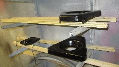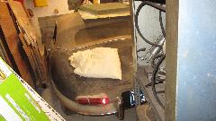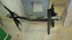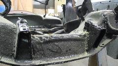 Today we were off to visit Ray's off-site basement workshop. This is normally a wood working shop where he does custom cabinet work, but it also doubles a the body work and paint shop for his second MGA project. There is no garage door here, so the trick was a few friends tip the body and frame on edge and walk them through the pedestrian passa ge door. When finished they will go back out the same way to be reassembled in his home garage. A special note here is the permanent riveted shims installed by the factory to square up the frame mount for the steering rack.