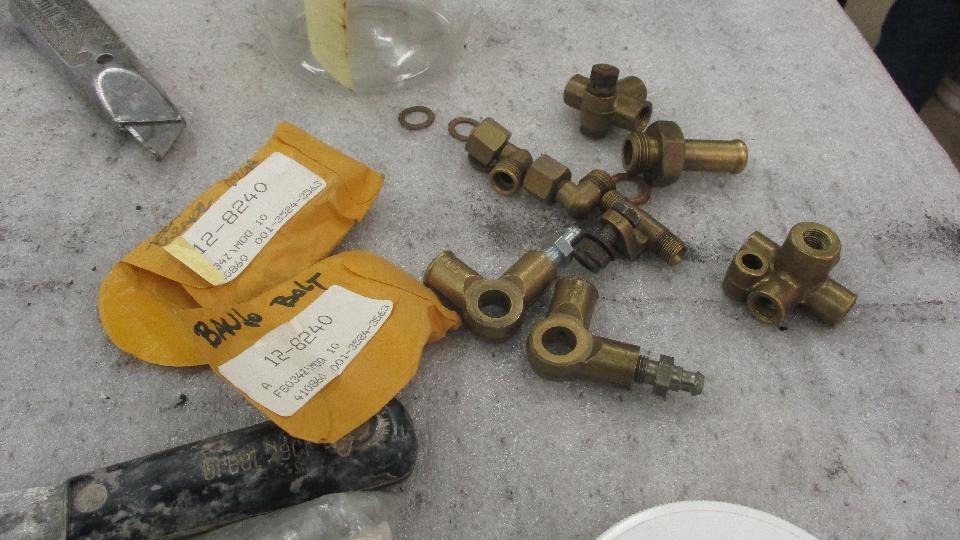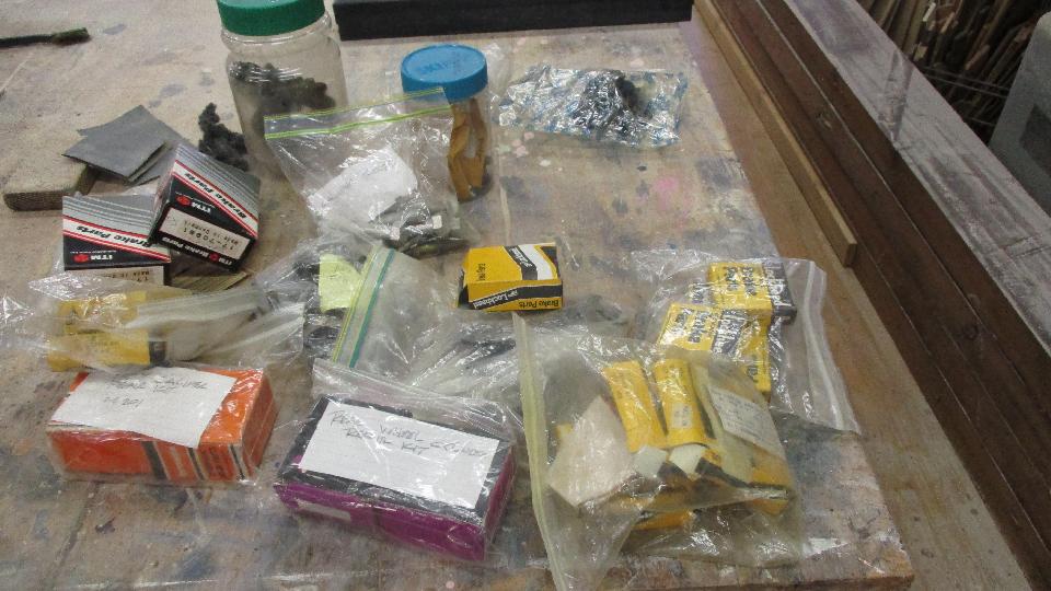Lots of small parts cleaned and ready to reinstall. Wondering if I can identify the brake light pressure switches by the stamped numbers. Everything in the last picture looks like new brake and hydraulic parts. We spent some time identifying parts. In some cases we found enough parts for three or four cars, but I don't think he will be buying more cars just to use the spare parts.