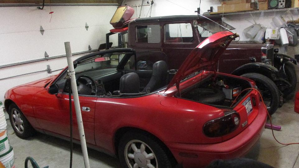 In the evening we were in Putnam Valley, NY to visit Steve Trovato (another contact with Eastern New York MGA Club). I'm thinking there may be something magic about the two car garage, as once we stepped inside there were at least seven cars in there. Start with a MG ZA Magnette which is a well patinaed original type daily driver car, and a SUV (to be named later). Then a driver Miata and Ford T.