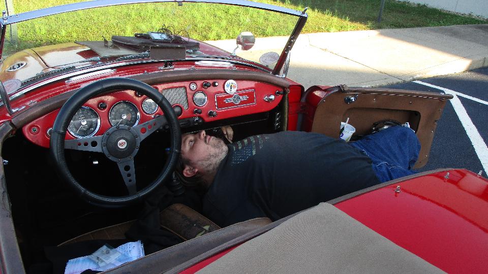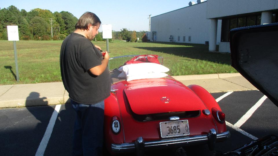 While cruising down the expressway this morning, we were being followed for about 20 miles by some non-descript road appliance. Speed up, slow down, change lanes, no matter what we couldn't shake him. Last ditch effort was a rather sudden lane change and duck off an exit ramp, but that didn't do it either. When we stopped for breakfast the appliance followed us into the car park. This was followed by show and tell and a two hour chat with a very nice fellow who was tickled pink and very curious about the MGA. Perhaps the guy may end up buying one.