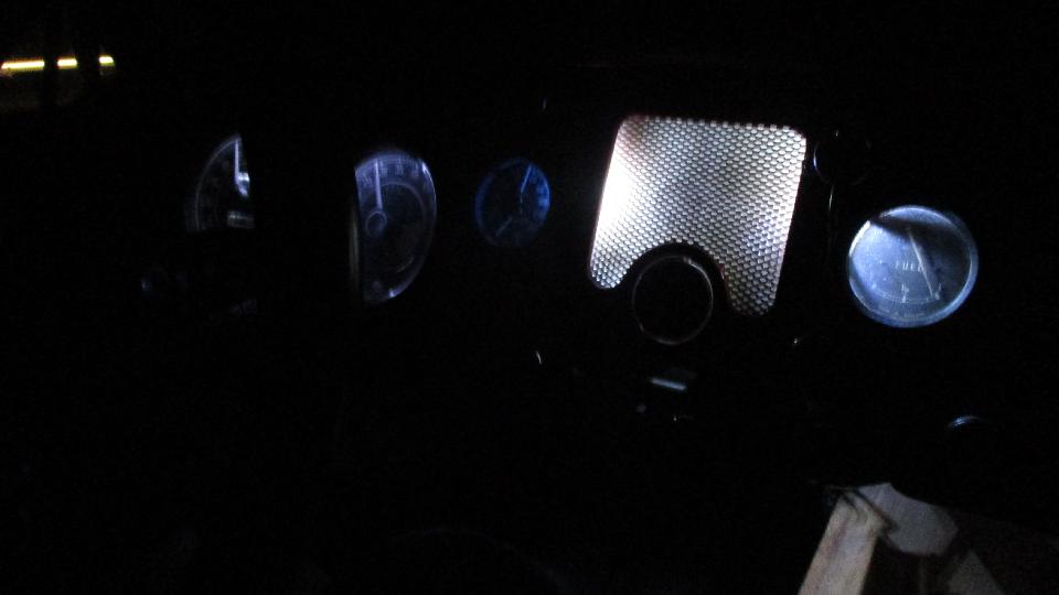 This was an opportunity to try the brighter LED bulbs for the smaller dash instruments. Later night we had a bit of surprise. Certainly plenty of light in the instrument dials, but WAY TOO MUCH light spill over through the radio speaker blanking plate (silvered card stock) and under the dash. Will consider what to do about that later.