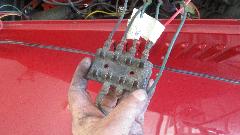 While comparing old dash harness to new dash harness, and transferring bulb sockets from old to new, we found a burned wire. This would be the 18-gauge wire normally used to connect glove-box lamps in the TF. Best guess is it was connected to that interesting map light cigar lighter and when someone pressed the lighter the high current draw fried the wire. That incident may have been the impetus for someone installing up to 10 additional fuses in the old hacked up wiring harness (just speculation).