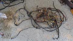 In mid afternoon a short break to order some rubber grommets and lots of wire connectors, then back to work. Dismount and pull out rear harness underneath the car. Disconnect everything in the cockpit, and pull all of the wiring out from under the dash. We finally found one inch of braided cloth harness cover under dash near the steering column, but even that ripped apart with light finger pressure. Probably not three original snap connectors in the whole car. By day's end we had a pile of tattered old wiring "junk" on the floor. The nice impression then was, this car looks so much cleaner without all that trash inside, and no more wondering which wire goes where. We are a little concerned that there don't seem to be any bulb holders on the new replacement harness, so save the old ones for now.