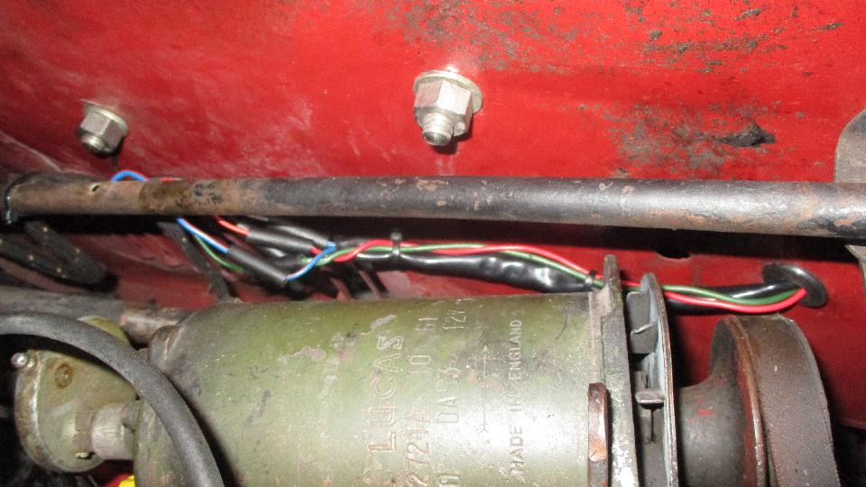 A little more progress on the TF. Dan had a new pair of cheap electric horns, but decided not to install them. The original Windtone horn still works, so that was re-installed (in spite of the fact that it has multiple cracks in the mounting brackets). Not sure exactly the original location of the harness attachments, but tie-wraps are a lot easier than original P-clips.