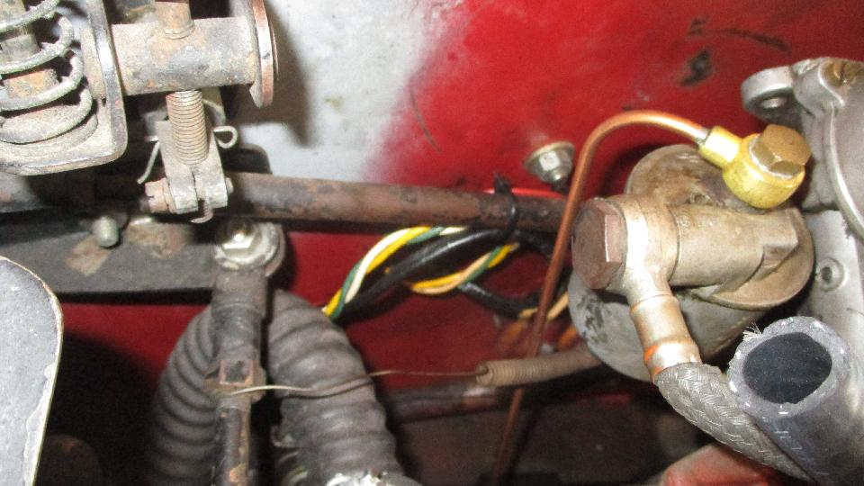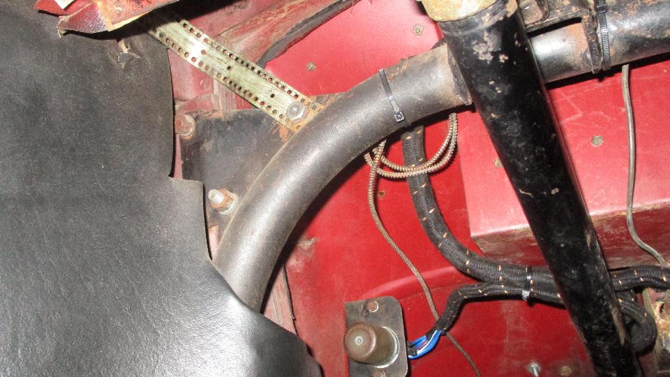 The temperature sensor pipe had copious loops along side the engine, looked a mess. Spent a little time re-routing the pipe along side the engine with a flex loop at the bulkhead, and the excess pipe pushed through the firewall (underneath the ignition coil) where excess will be wound up out of sight and out of harms way (above left).