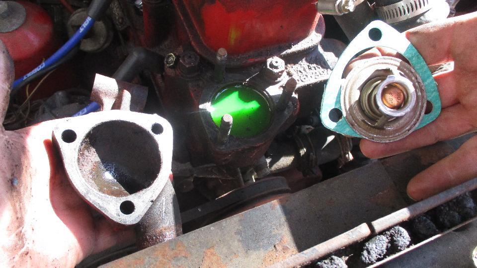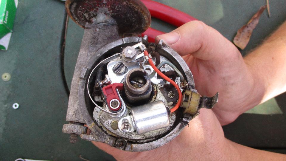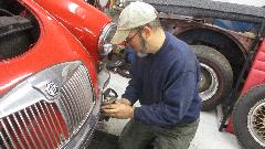 We last left Bill with his 69 MGB with fuel feed and spark from the coil, but no spark to the plugs (needing all new HT wires). Also no way to bleed the brakes (clogged flex hoses). Today he had the parts, and new spark wires installed, but still no fire. Pulling new points and condenser out of the magic trailer we got stronger spark, and with a shot of ether it was running (for the first time in at least 12 years). Lots of water circulation during warm up indicates no thermostat, so the trailer produced a good thermostat and new gasket.