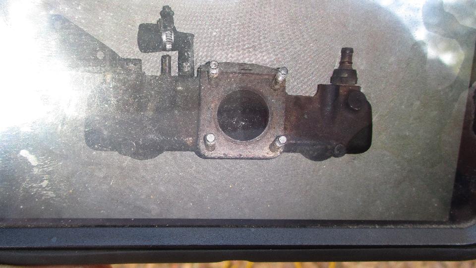 Before leaving we had a quick look at the '79. I thought the engine was out, but apparently only carbs and manifold were out for service. The one-piece intake/exhaust manifold was being cut down to remove the exhaust parts but retain the intake tract. This would then hold a single 1-3/4-inch SU carburetor in place of the original Zenith-Stromberg carb, and to be used in conjunction with an earlier exhaust manifold. Bill has a pro mechanic working on this. Will have to check back later. The last image is a photo of a cell phone picture, just to get the idea where it's going.
