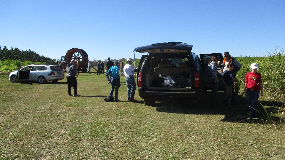 Then we were off to visit the cane fields, several miles out of town and nearly a mile off road (grass on sandy soil being fairly solid). The landing site was on the side of a small lake (or very large pond) near a coral containing some wild horses (figure that out for yourself). After a nice picnic lunch (and a photo op for the cars), most of us piled into a few sport-utes for a short trip through a slightly more difficult off-road route.