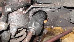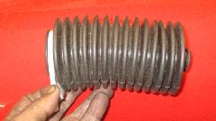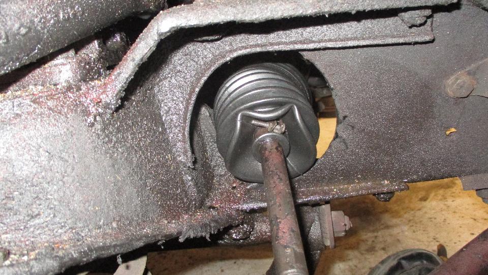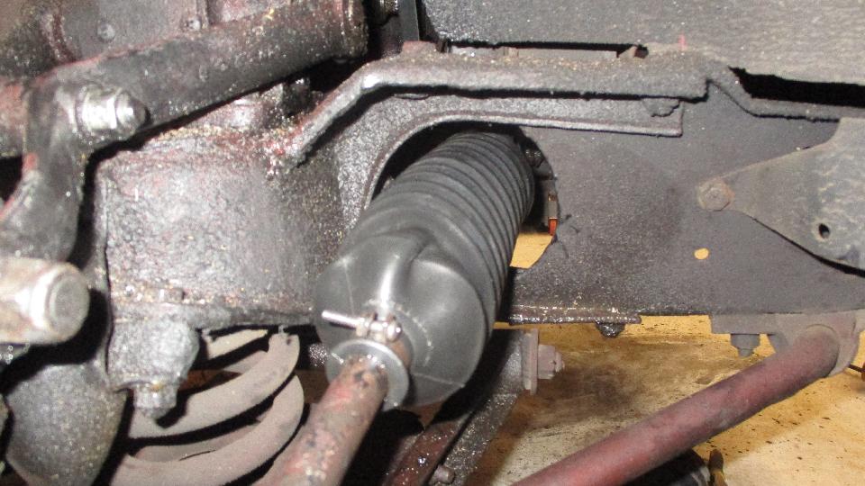 We found a split boot on the steering rack. It is thin stiff plastic with only 11 convolutions, destined for early failure. This piece of crap part was replaced 20 months and 62,000 miles back. The inferior part came from my garage inventory at beginning of trip 2-1/2 years ago, no record of how long it was in stock before that. While it is (was) a problem part in the past from Moss Motors, it is not the same as current sales parts. The one I am installing was purchased in April 2015 (immediately after the crap part was installed, in anticipation of its failure). The new part is almost at thin but has 14 convolutions and is much more pliable material. The inboard clamp groove is too narrow so the original clamp will not fit, so it had to be secured with a nylon tie-wrap (but save the original clamp for future use). It may be a bit too soft with a bit of an issue when installed.