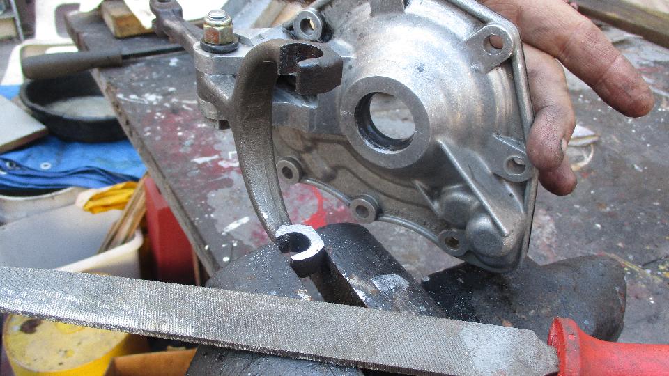 Several days on we are back at Tech Central in Bonita Springs, mid morning, intent on reassembling the MGB 4-synchro gearbox we took apart a week earlier. As usual, nothing is easy, so one problem at at time. First issue was a new clutch release bearing that was too wide across the shoulders and would not fit into the release arm. The expedient "bodge" to make it fit was to file off the inboard sides of the release arm cradles. Man, I hate bastardizing a perfectly good part to accommodate a faulty replacement part. If they ever install another release bearing with correct dimensions, they may have to replace the now bodged up release arm.