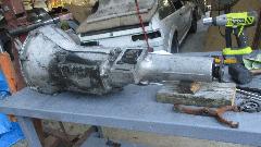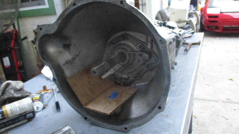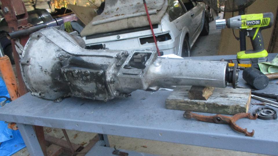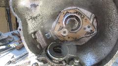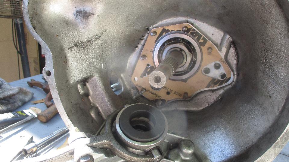 The long spacer tube will hold the speedo gear in place, as well as the center roller bearing and oil pump spool/spacer. Two shims in back prior to the rear ball bearing to have proper fore/aft alignment of the mainshaft. Shove the rear housing into place, including the rear ball bearing held in with snap ring, with some physical encouragement and bolt tightening to the main case. Insert a new rear seal,