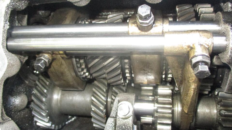 So back to the bench, unlock the locktab on the mainshaft front nut, unscrew the nut, remove half the parts from the mainshaft, swap the sliding hubs, and put it all back together lickety split, no problem. In short order, laygear in bottom of the box with small guide rod to hold thrust washers in place, input shaft stuffed in the front (with spigot bearing in place), and mainshaft assembly stuffed into rear. Stand the assembly on its nose long enough to center up the laygear and thrust washers, insert the layshaft, and set it back level again. Then reverse gear with shaft and locking bolt in place. Follow this with three shift forks, shift rode, and locking screws.