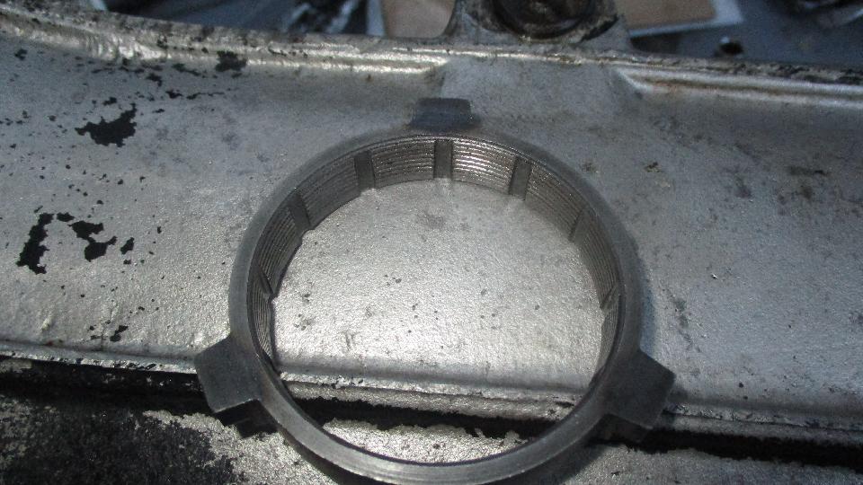 Nearly finished. Install the shift selector interlock (so you can't catch two gears at once), leave the shift extension off (to be installed after in the car), install the side cover, and leave a note to R&R the front cover to add the required shims for the input bearing outer race. Pity we hadn't measured this to determine that shims were missing last week. Now they need another parts order for the shims before it can be returned to the car. Last photo is the half worn 2nd gear synchro ring removed (headed for the dust bin). No one could find the removed broken 3rd gear synchro ring for a picture today, but there is a picture of it on prior page from Jnuary 14.