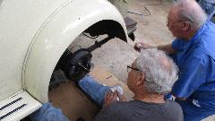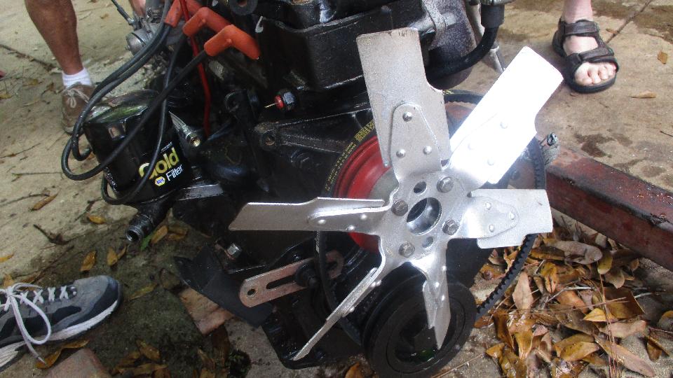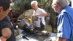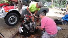 The guys were stuffing the rebuilt 4-synco gearbox back into the MGB. Before I arrived they had reinstalled the front cover without the proper shims. Someone suggested it was running like that before it came our of the car, so no harm done? Grrrr. At least it got all new clutch parts. After two weeks of noting that the cooling fan was backward, I recon no one was going to bother, so I turned it around before they could stuff it back in the car. By day's end it was driven away.