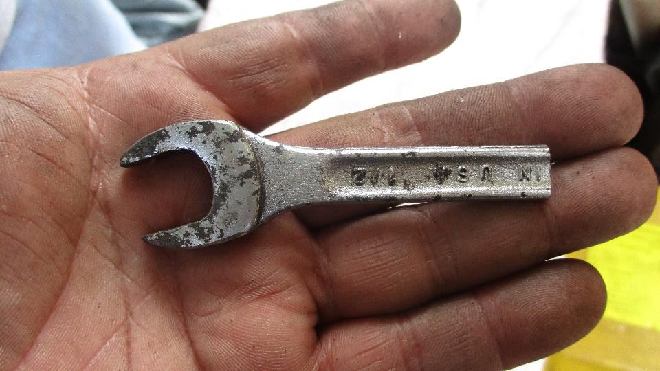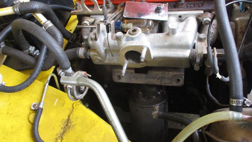 The yellow Midget was having the catalytic converter replaced with a pipe, carburetor reinstalled and tuned up. It's a bear of a job reinstalling the bottom nut for carb mounting. Where's ten year old kid when you need him? They already had a wrench cut down to get in there. I ground the sides off of it to make it narrower for easier access. For final tightening a thin wall box wrench got in there a half flat at a time.