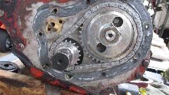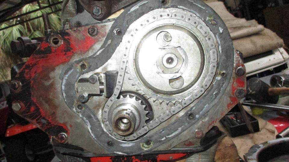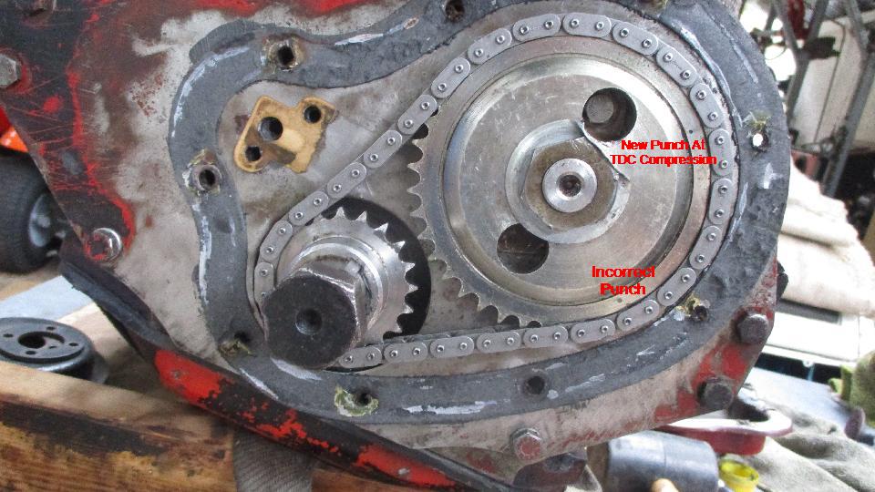 But the most irritating issue was that cam timing was way out of whack due to a misplaced punch mark on the cam drive sprocket (manufacturing defect). Good thing I was checking this before it was installed in a car. Not too much work to pull off the crank pulley, timing cover, chain tensioner, and the timing chain and sprockets. Setting proper cam timing only took a few minutes. Then did the right thing by putting two punch marks in the right positions 180 degrees apart, and scratch a big "X" across the incorrect punch mark. Never depend on the punch marks being in the right place. Putting it back together was standard grunt work. Got the covers installed before we lost the light. Still needs the distributor drive gear to be realigned, valve adjustment, plus cleaning and painting.