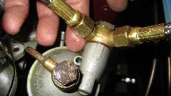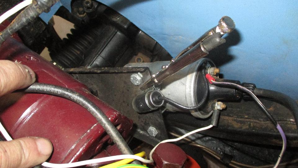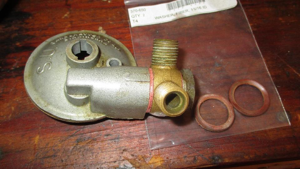There was fuel in the float chambers, it cranked over okay, and a shot of starting fluid did not make it run. Other side of the engine quickly revealed a very weak spark, must be bad condenser. My magic trailer was all out of Lucas condensers (odd, need to order more). I did have a spare Mallory condenser, but it is larger and does not fit inside the Lucas distributor. Easy solution. Remove bad condenser from the distributor, scrape paint off of the coil mount bracket, clamp the Mallory condenser on with a small locking pliers for ground connection, and connect the lead wire to the coil terminal leading to the distributor. It fired right up, score one for the good guys. In process of adjusting the carbs we found a fuel leak at the rear banjo fitting. Tightening the banjo bolt didn't help. A new pair of fiber washers should fix this, but the new washers were too large OD to fit into the counterbore on the banjo fitting. Another easy fix just sand down the washer OD a smidge and it's good to use.