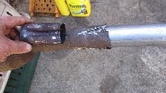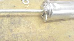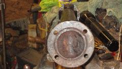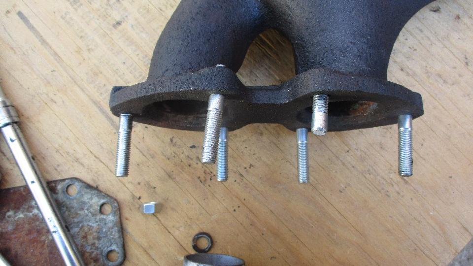 Then we spend considerable time massaging the exhaust system. Old 2-into-1 front pipe was perforated, so a new one was to be installed. This required extraction of the old header pipe from the intermediate muffler. Typical pipe slitting, cold chisel, big hammer, and a few bruised knuckles, but ultimately got the job done. The iron manifold had been farmed out to a local shop to extract the bottom studs with heat, and that was slightly bodged when it came back with three crooked tapped holes. With angles studs the mating flanges would not assemble. Trying to bend a stud into alignment resulted in a broken stud (good hardened studs). So a quick trip to a local parts store for a replacement stud, after which we elongated one hole in each flange to get the parts to mate.