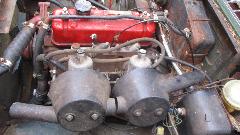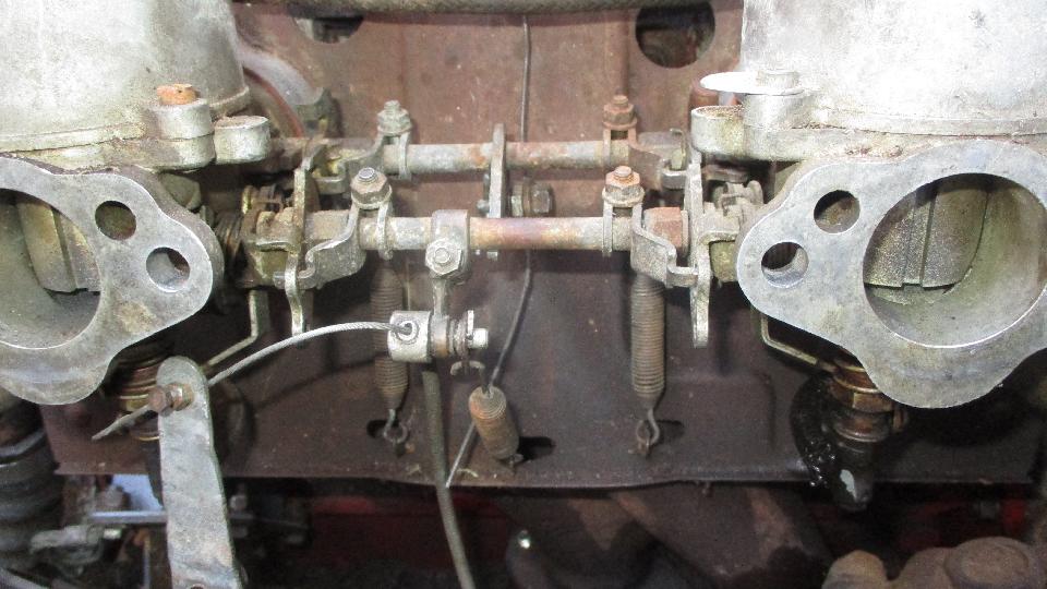 This job is getting somewhat drawn out, and we were intending to get the MGB back on the road today. First up, loosen the carb mounting bolts, push them apart slightly, flip the throttle shaft around, and clamp it down again. Beat the cable mounting bracket back flat (some DPO bodge in throttle cable mounting), rearrange the cable trunnions, install return springs (not quite like the book illustrations). Then we noticed the missing engine mount rebound brackets which we have forgotten to install the day before.