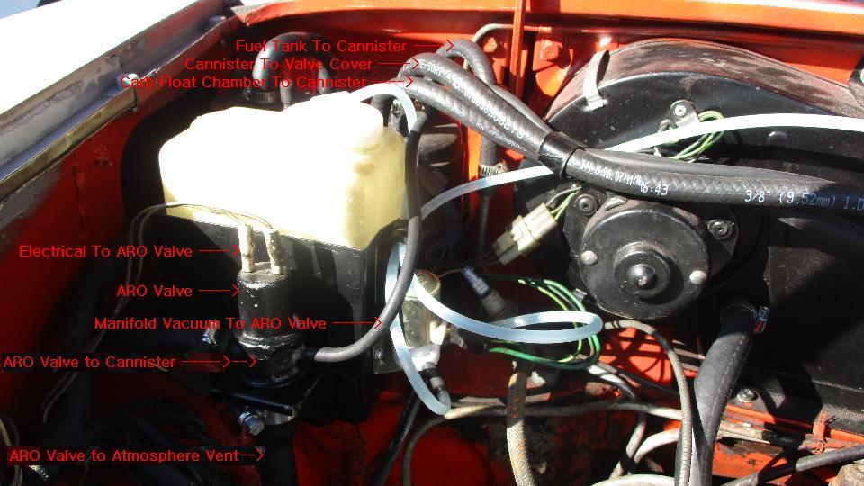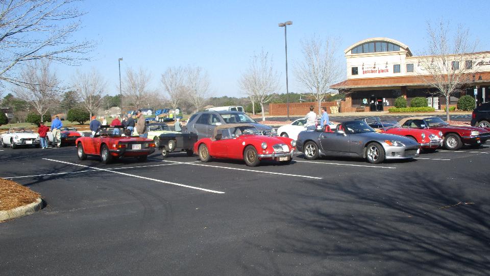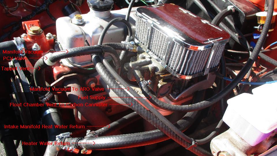 Tour day with British Motor Club of Montgomery Alabama, kick-off time 9:30 am in Pike Road, AL, with about a dozen club cars assembled and ready to roll. But first I have to check out Terry Young's MGB that got the electrical work and carburetor modification the week before (last Monday and Tuesday). See if you can identify the valves and hoses for vacuum, vapor recovery, anti-run-on, and positive crankcase ventilation.
