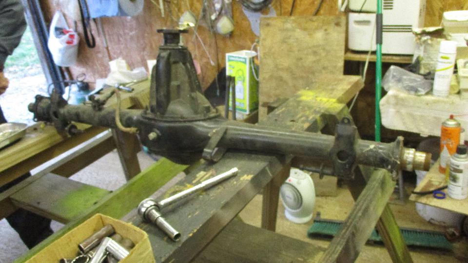 Start with email and check BBS, then post a new tech page on damping shift lever vibration. Finish prior photos and notes. Then we took a cruise in the countryside to rural Greenback, Tennessee to visit Larry Benson. Been here before, and the dogs remember us and are plenty friendly. We are here because Larry has a spare MGA rear axle that may have parts we could use. It has a standard 4.3:1 differential, no hubs or wheel bearings or brake parts, but we don't need any of those parts. Only ten nuts to remove the pumpkin. When I was wiping oil and dirt off of the ring gear it was at first looking promising.