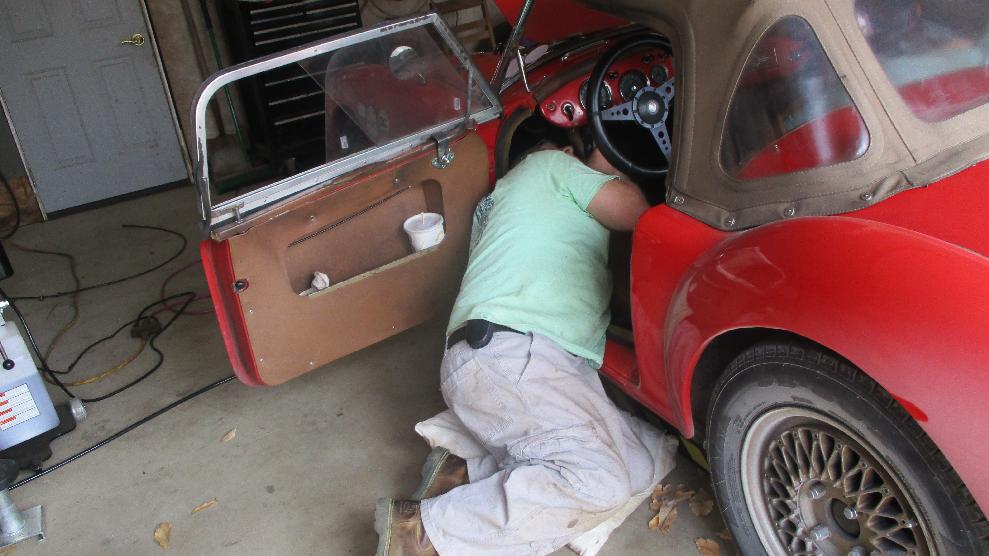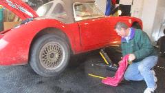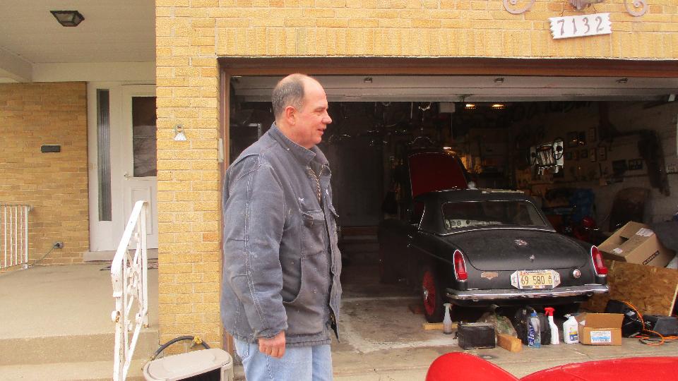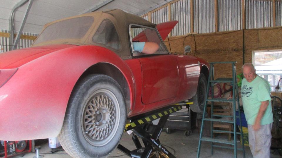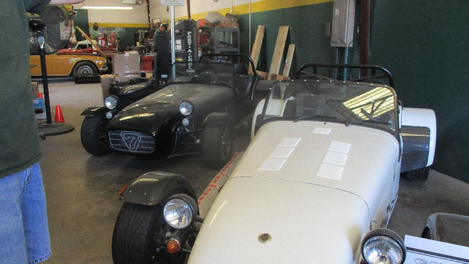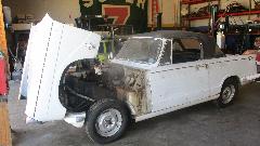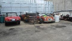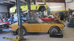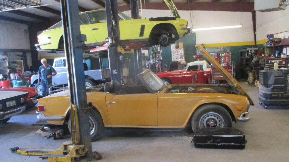 Kicking around the shop a bit to see what kind of toys may be in process today. The yellow one on the hoist is a Jensen Interceptor. You would recognize the TR6 and the MG Midget. The white one may be a Triumph Hearald.