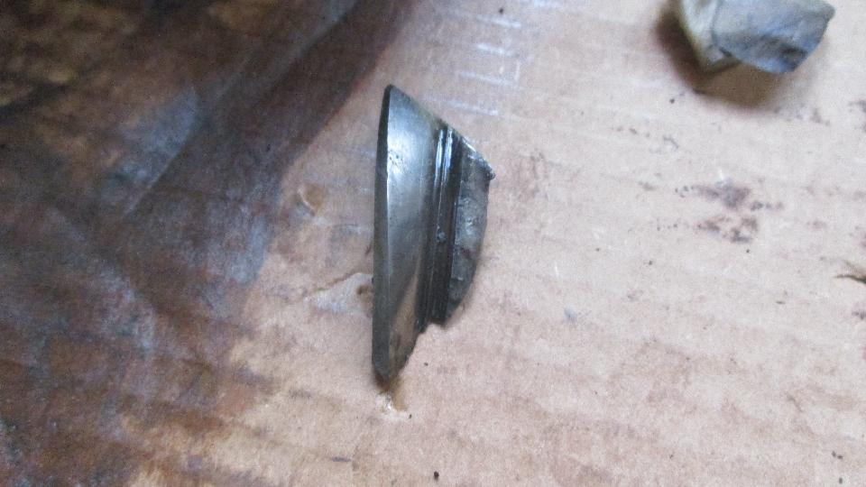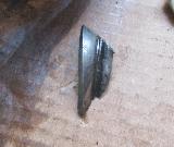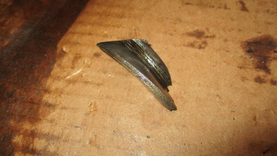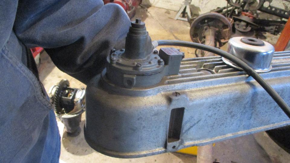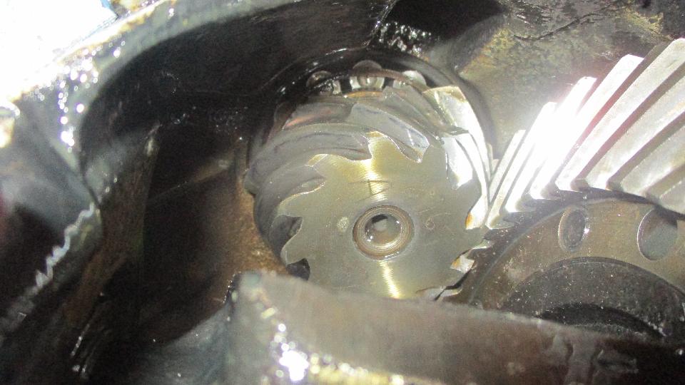 With just a bit of time to spare there was a slight diversion. Jack up the right side for better access to the gearbox speedometer drive spindle. Disconnect the tail end of the speedo drive cable, and pull the driven gear and spindle out of the gearbox. This one was a nice original steel gear with nothing apparent wrong with it. Really? Put the spindle onto the cable and turn the gear by hand to turn the cable. Turning the bottom end, but no turning at the top end. Rats. Pull the broken cable out of the jacket in two pieces. Bummer. All this mucking around because the used replacement cable was broken. Grrrr. Reassemble the driven gear and spindle back into the gearbox, reattach the empty cable jacket at the bottom end, and off we go with still no working speedometer. Live and learn. -- Okay, for the curious, here is what was bugging the noisy differential. We found one very large fragment of broken gear tooth from the input pinion gear. This would give the characteristic gear tooth chatter with each rotation of the input shaft. Nice that it held up as long as it did, as it has been making unsettling rattling noises for more than six weeks, at least 4000 miles.
