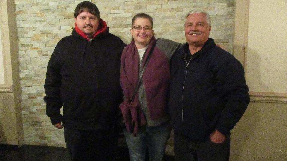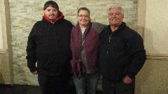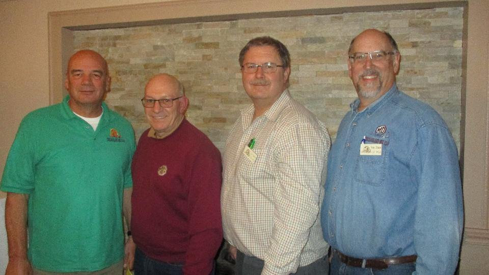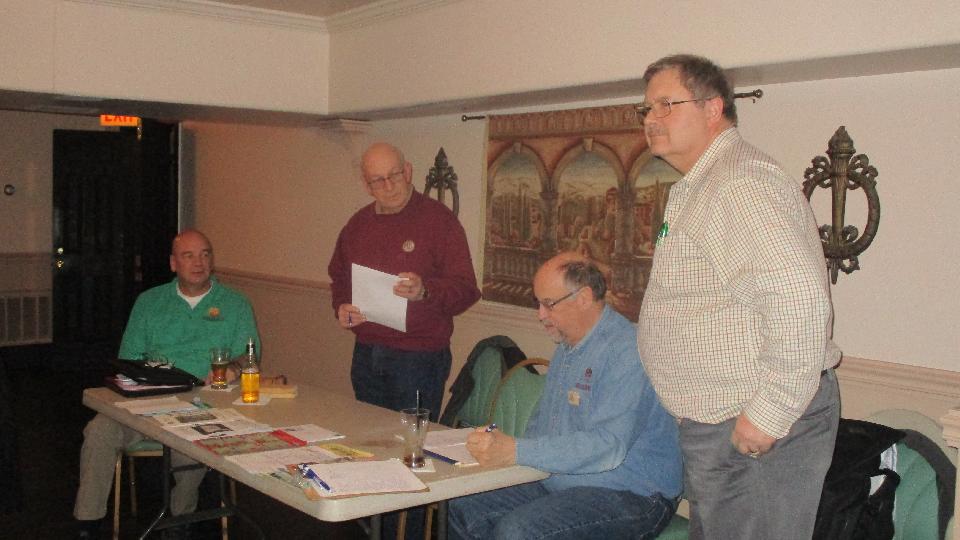 While Chuck and I were messing around with the differential and speedometer cable, navigator was installing a new tapping plate for the passenger side door latch striker. He seems to get a little incentive when his right ear is freezing while blasting down the expressway. Stripped threads be banished, and the door latch works again. Finally after packing up the trailer with tools and two duff differentials, we were off post haste for the evening club meeting at Mack's Golden Pheasant in Elmhurst, IL. Nice meeting, but oh what a motley crew. I had to come up here all the way from North Carolina to get the mug shots of the club officers because no one else would take the pictures.