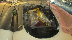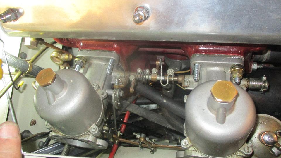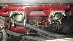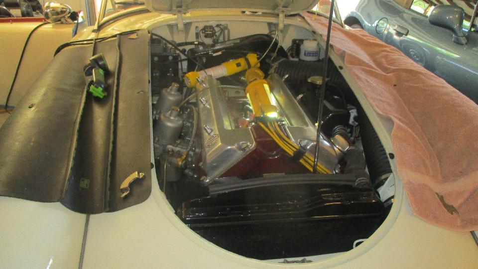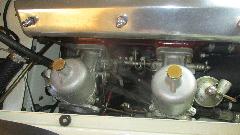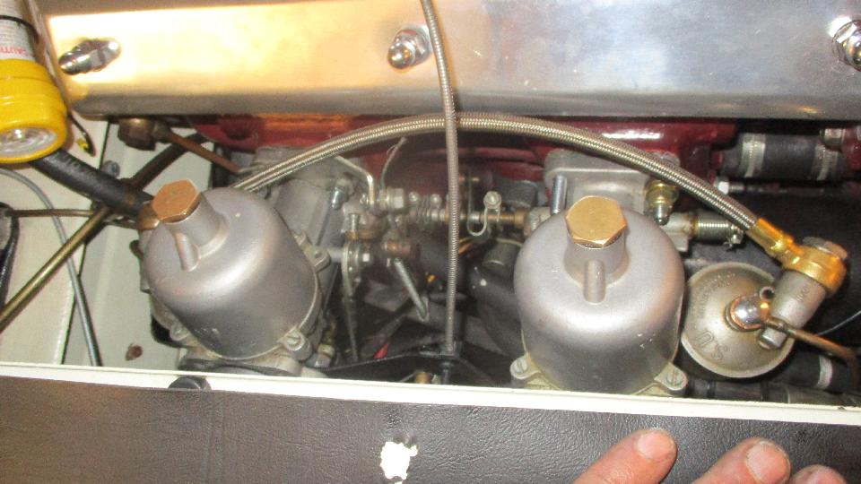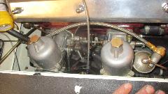 Getting close. Carbs back on the car, cables and springs and hoses installed, oil in the dashpots, and two turns down on each of the mixture nuts. Time to see if it runs. Switch on, ticky-ticky, fuel pressure up and no leaks.