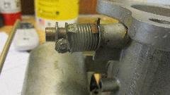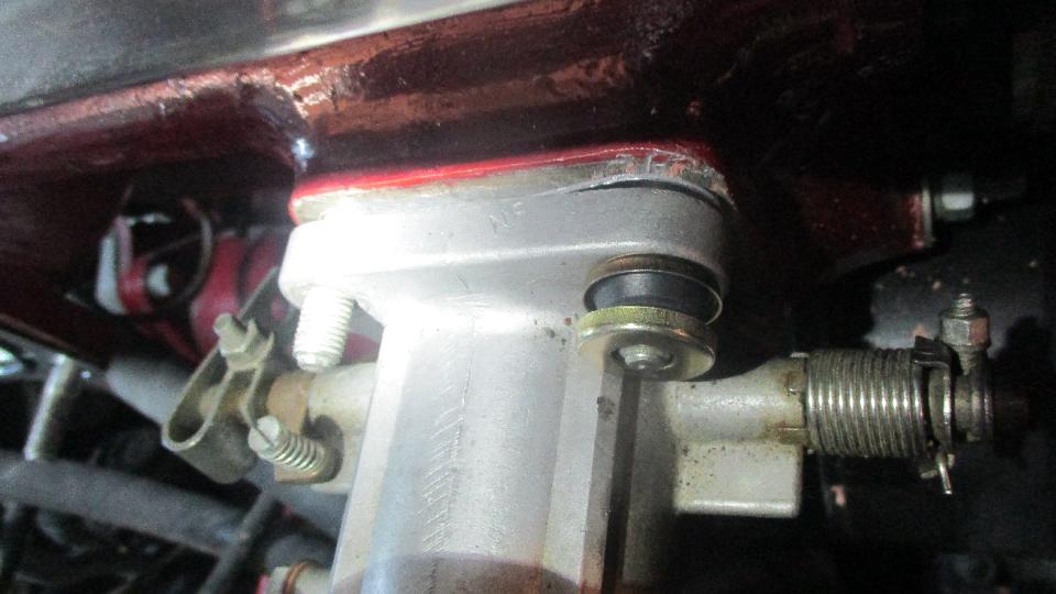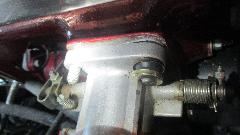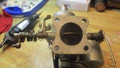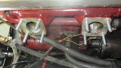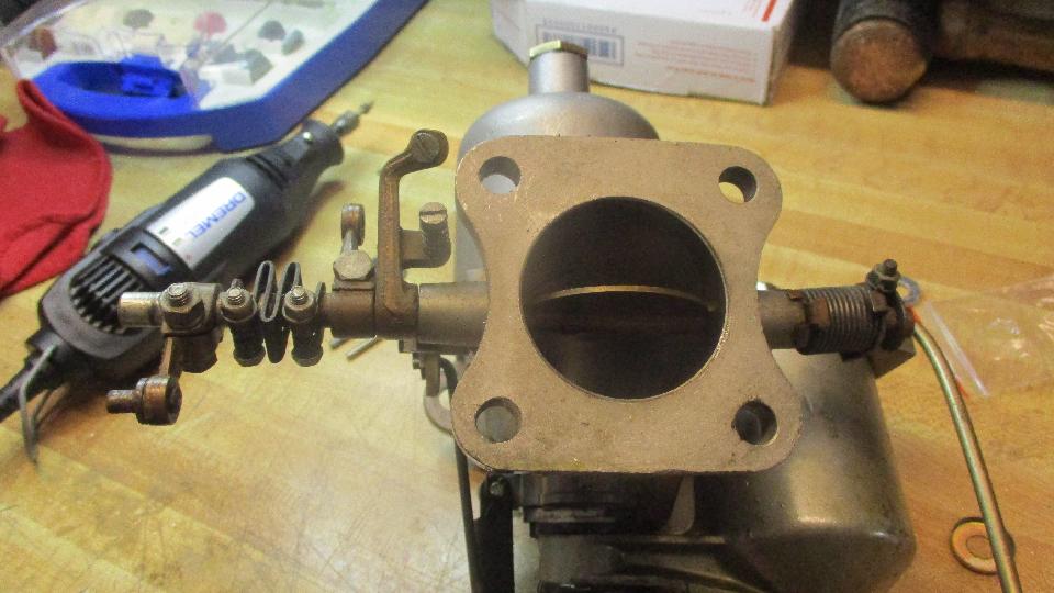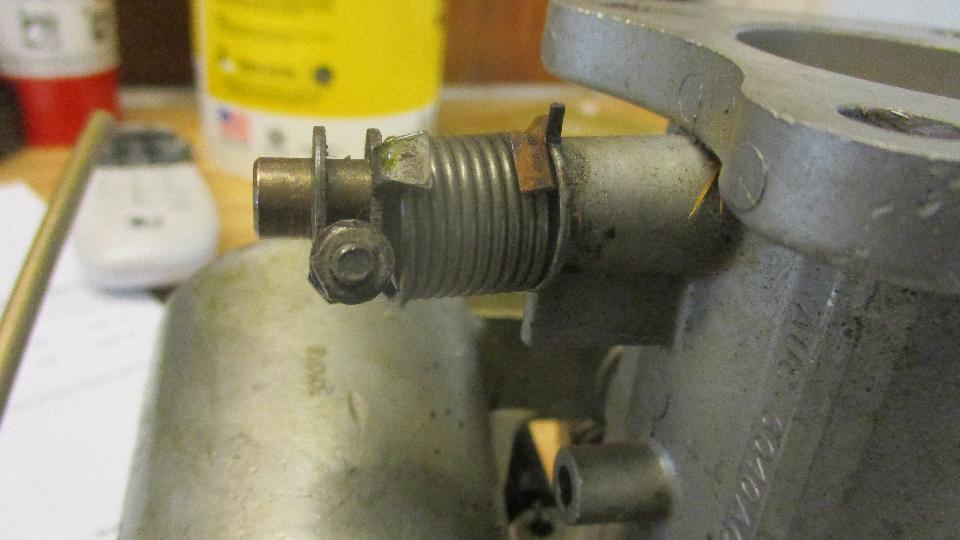 The short studs were not such a big problem. While I was removing the old studs Phil was off to a local auto parts store to buy longer studs. Next problem found was the wind up torsion springs for throttle return on each of the carburetors. They are supposed to be right and left handed parts with opposite wind up direction. These are both right handed, or for the front carburetor, so the one in back was trying to hold the throttle open instead of closed. After lots of searching we could not find another spring handy, so I did my best to make the wrong spring work by winding it in the opposite direction intended while modifying stops on the clamp washers to retain the spring ends.