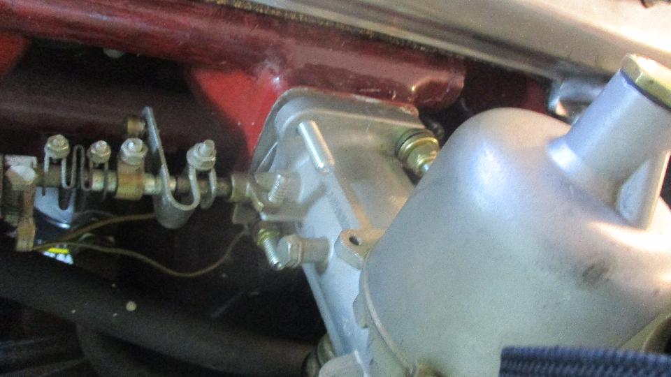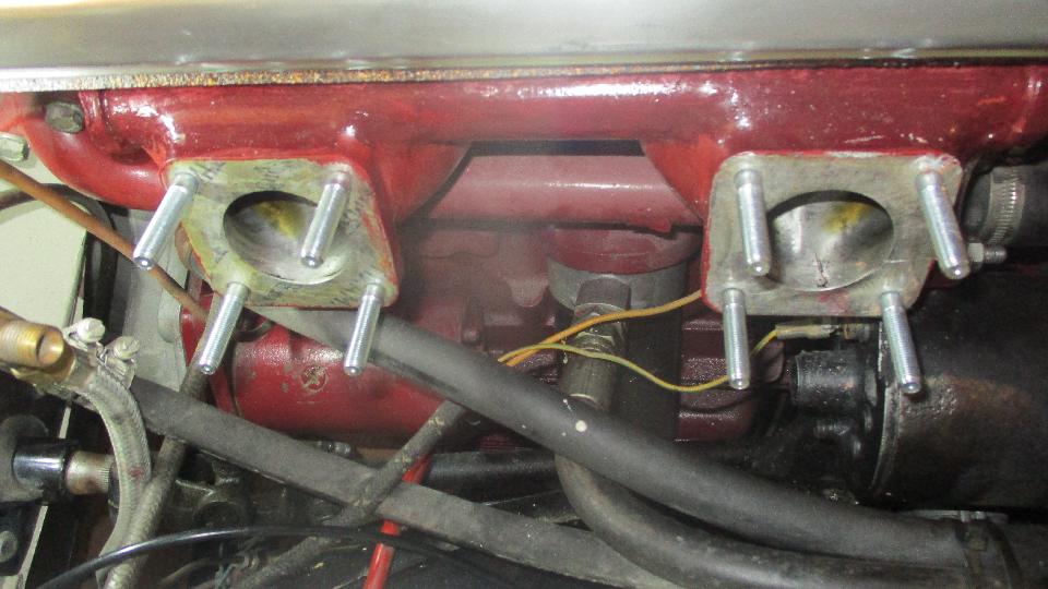 Okay, on to the carburetors. Disconnect choke cable, throttle cable, and fuel hoses, making note of where springs and brackets are placed. Then elongate the holes in the soft mount plates to span the diagonal studs on the SU H6 carburetors.