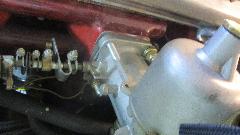 Loosen distributor base clamp so it can rotate, and give it a little push. Back under the front with the timing light, and repeat the timing check. After 4 or 5 iterations of this exercise we had 31d-BTDC at road speed, and 5d-BTDC at idle. Reinstall the vacuum pipe, and check timing again. This time it gets up to 51d-BTDC at road speed (and light throttle), a clean 20 degrees of vacuum advance. That should get better gas mileage on road touring, as long as no one gets paranoid about the vacuum advance being present. Lock it all down and get back to fine tuning the carburetors. It is sweet running machine. And best of all, the original air cleaners still fit without touching the inner fender.