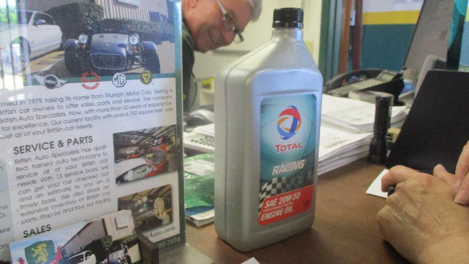 Yes that is a Jaguar XKSS, go ahead and drool. Fewer than 20 of these exist after a warehouse fire destroyed the rest and production was never resumed. The bottle of oil is Total 20W50, listed as a racing oil but apparently works okay in a street car. A lesser known brand being not very expensive, and having the key 1200-ppm of ZDDP (zinc) that we like as wear protection for vintage flat tappet camshafts. The Lotus 7's are a bit of a bonus.