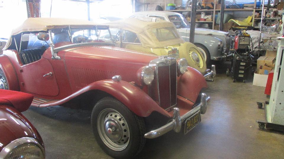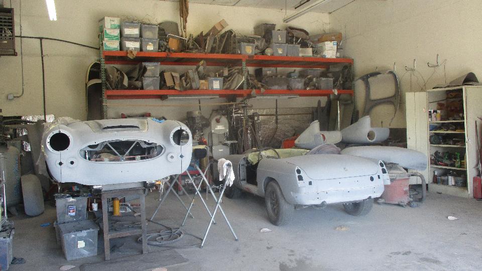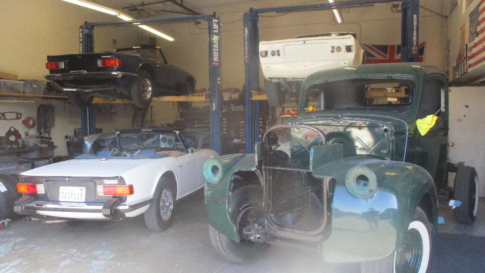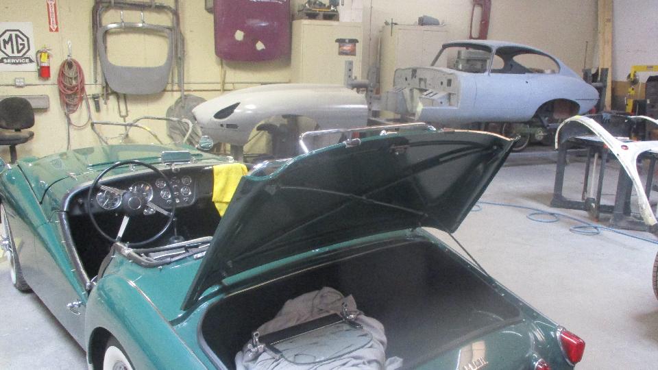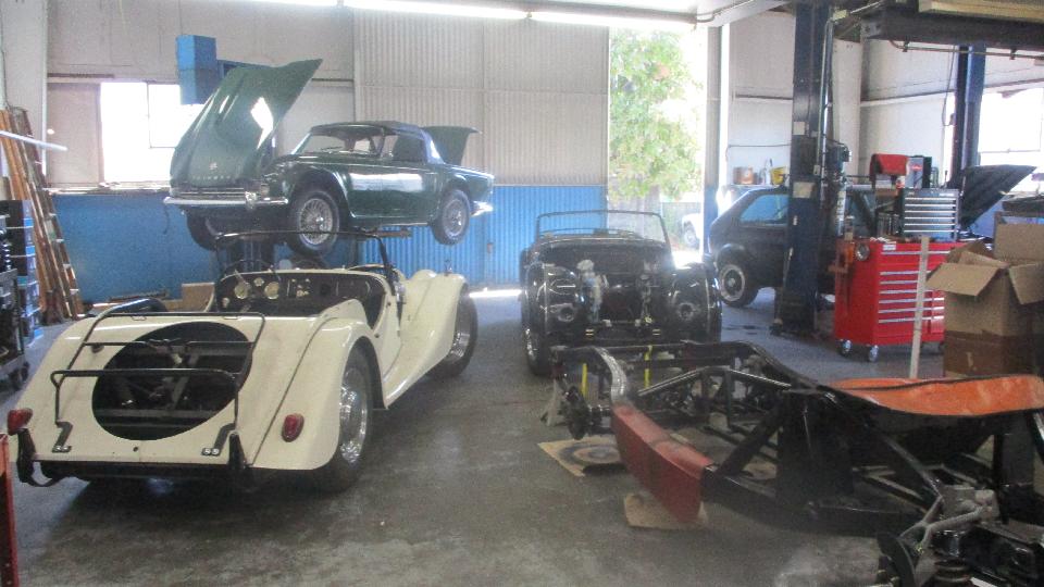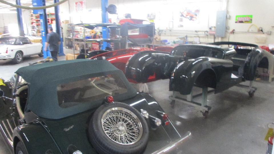 In the back room, an MGA chassis, a Morgan, TR3, TR4, and something nondescript hiding by the back door. Out back, more fun stuff most of it in process as indoor space allows.
