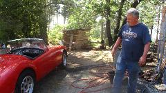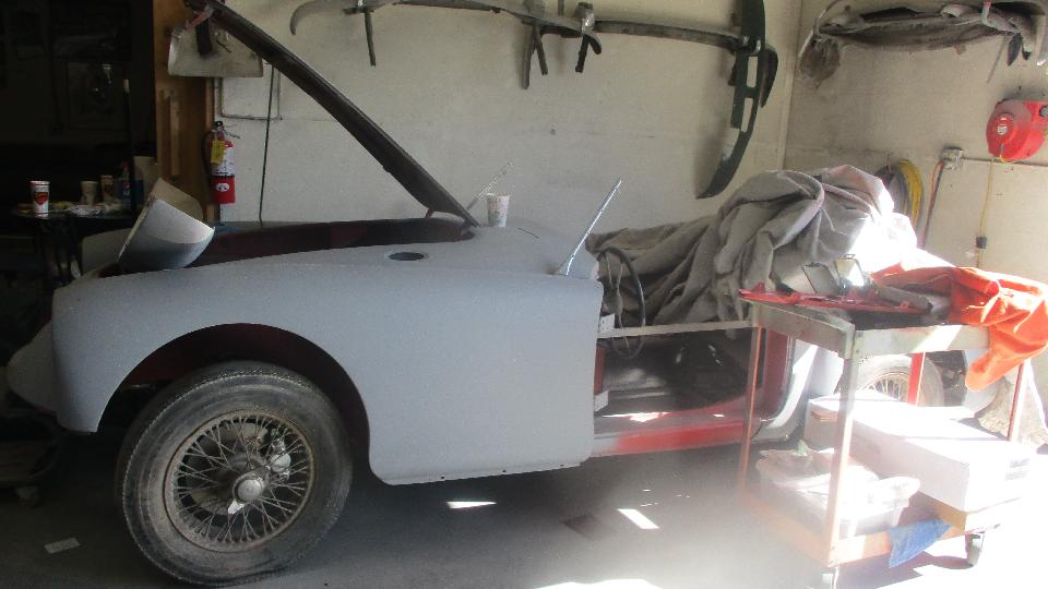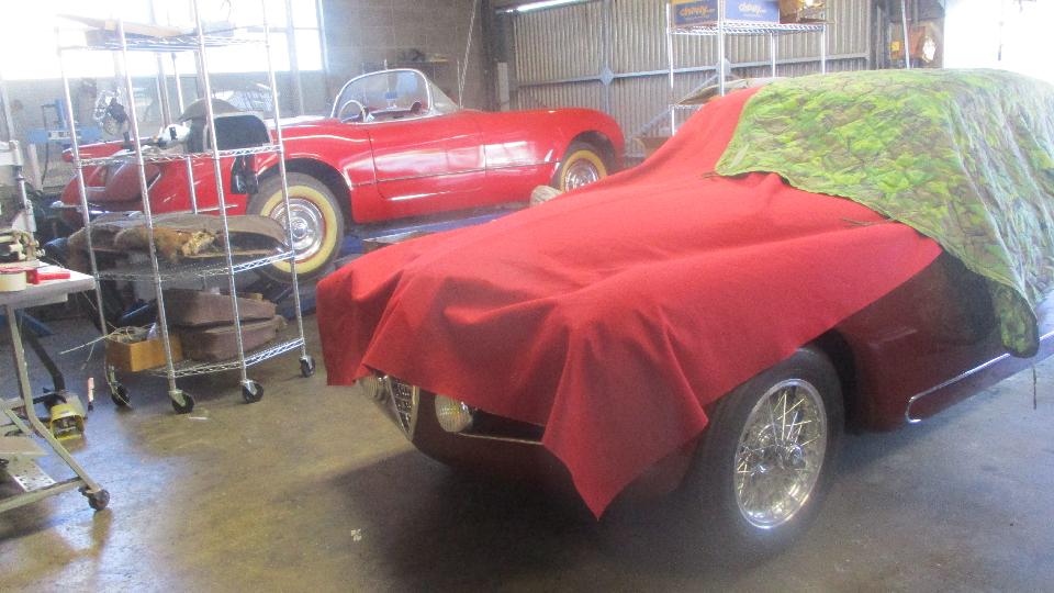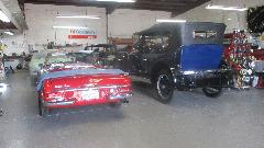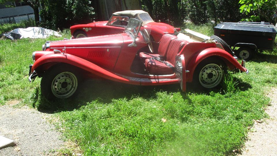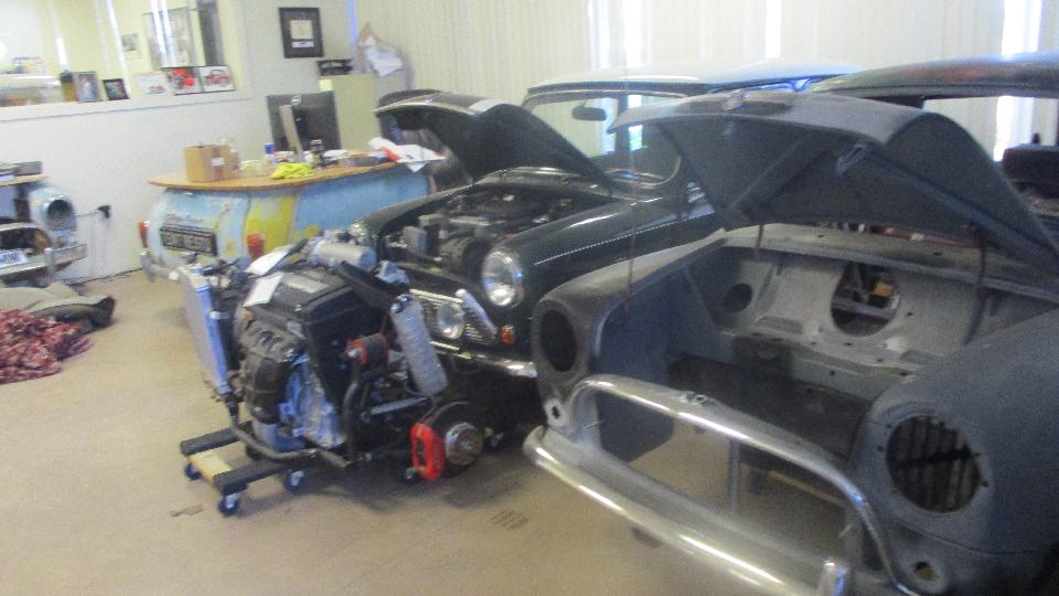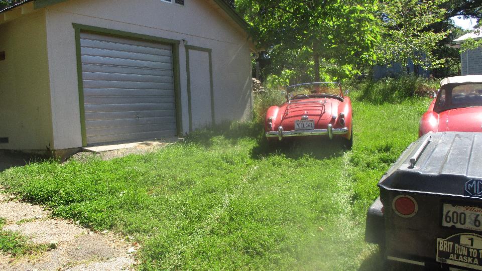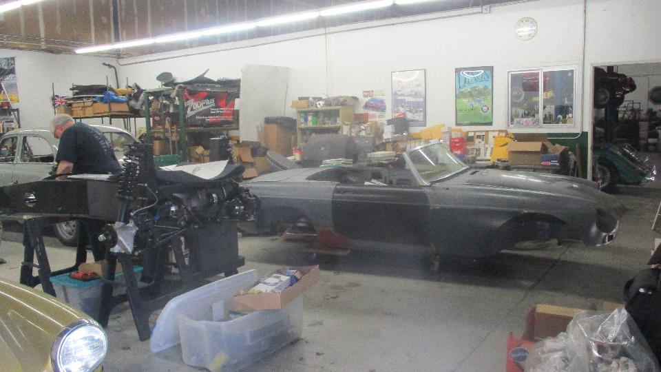 In the back room, an MGA chassis, a Morgan, TR3, TR4, and something nondescript hiding by the back door. Out back, more fun stuff most of it in process as indoor space allows.