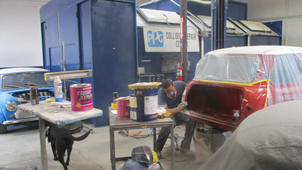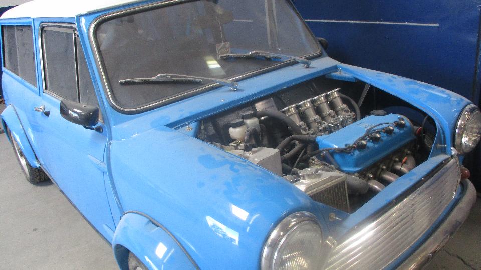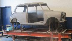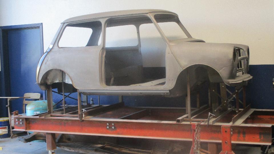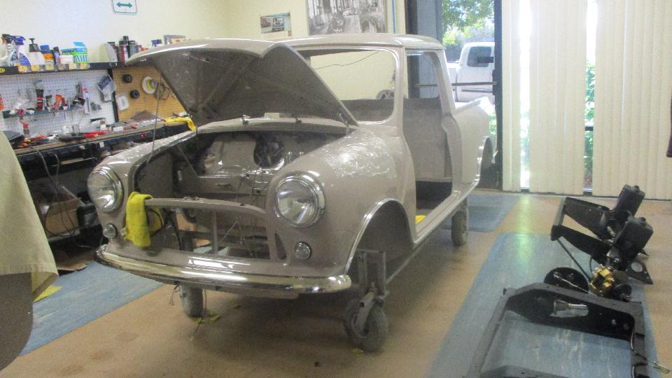 There is a fixture for aligning the body shell during reconstruction, a Mini in for minor collision repair, and a Mini pick up truck in the process of full restoration.