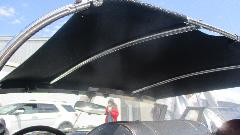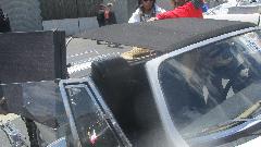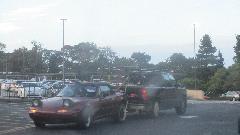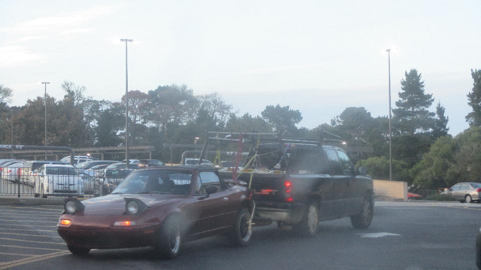 Just for kicks, we ran across this red neck towing job. The Miata was tied to the truck pipe rack with some web straps. I don't know how they got the lift, but the car tires were periodically skimming the pavement. Speed bumps in the parking lot were a nasty problem. Steering on the car was not locked, so the tires would turn by caster, and the car was more often sideways than straight. Sure hope they weren't going too far.