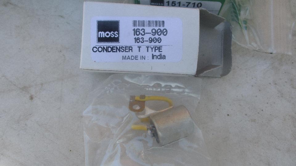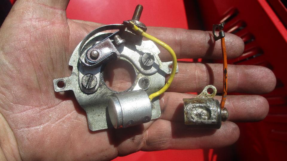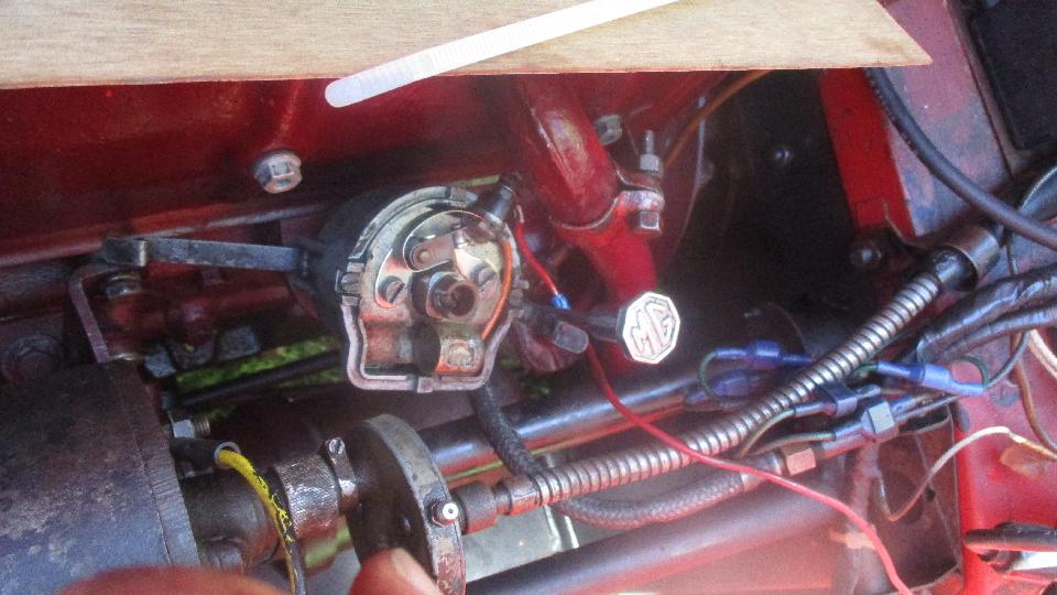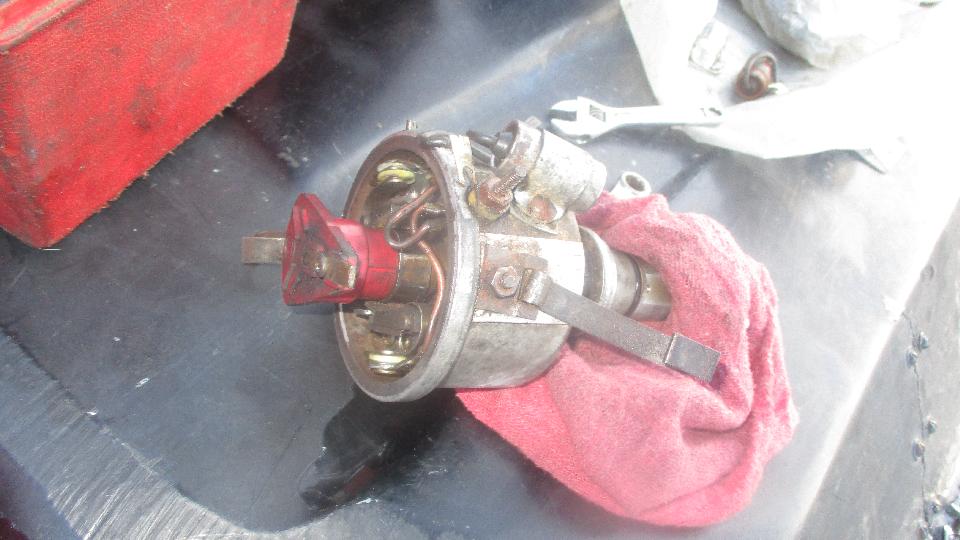 It seemed to be holding the fluid okay, but then it was misfiring badly, but would run not so bad with higher engine speed. It had been sitting a long time, and first guess was stale fuel, so we drained the tank, put in some fresh fuel, and took another test run. Still misfiring badly, the distributor cap and points and rotor all looked good, so next guess was bad condenser. Since restock two weeks earlier, the magic trailer does have a new condenser for the MG T-type (good planning). Pretty difficult to access the side terminal behind the vent pipe, so we pulled the distributor out for service. The new condenser looks a bit larger than the old one, but seems to fit okay.