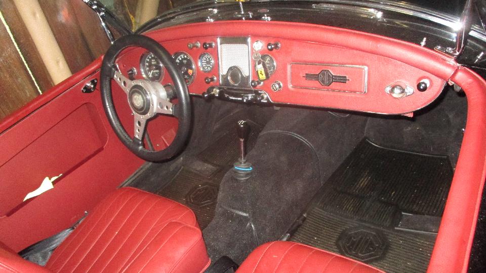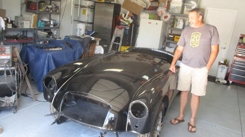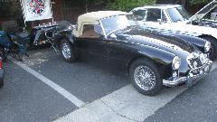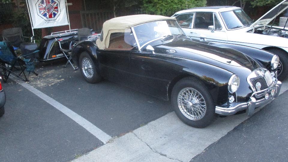 Across the street was another friend with an MGA. Last time we saw this one two years earlier it was a fresh rolling chassis with the body in early stages of restoration. Now the body just came back from the paint shop looking quite spiffy. We had a look at some front fender piping from a big Healey that was not used here. The chosen part was stainless steel covered piping which looks pretty sharp on the black car.