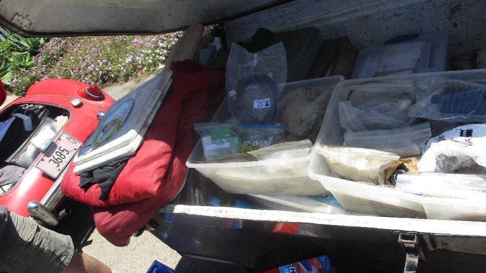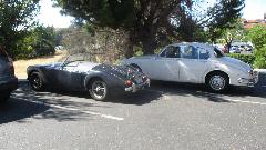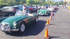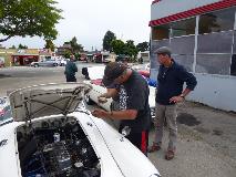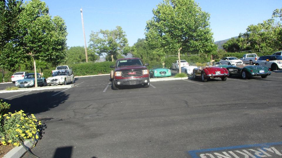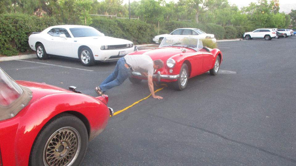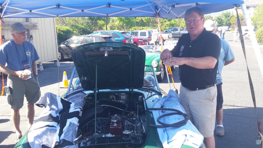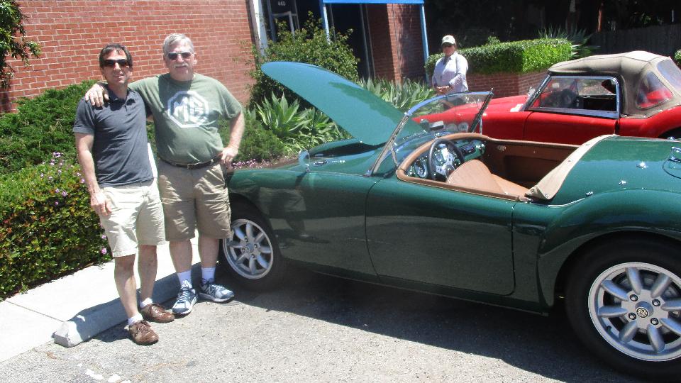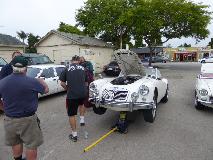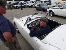 First business today was another stop at Moss Motors in Goleta, CA to re-stock the magic trailer. Some condensers, hydraulic repair kits, a heater valve, and a bunch of more minor service parts. For our own MGA, new seat slide rails to replace badly rusted ones, one tail light base, two tail light lenses to replace cracked ones, a fresh set of pedal cover pads, a spare speedometer cable, and return for exchange the second failed dipper switch. I cycled the new switch 100 times with power on, and it seems to work okay when new (time will tell). Moss finally got the correct pattern for the accelerator pedal pad, so all gold stars this time. While there, these blokes from San Diego on their way to the NAMGAR GT in Solvang just dropped in to see where all their parts money had been going.