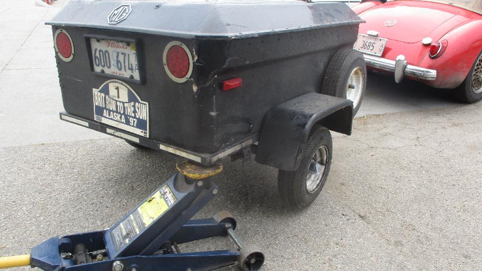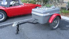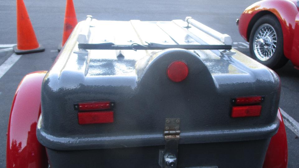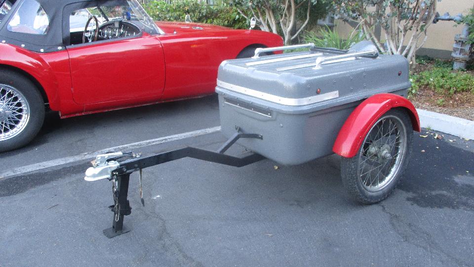 One of my favorite sports when little British cars get together is trailer hunting. This one looks like a light weight motorcycle trailer with narrow wire wheels and fiberglass box. Wheel bearings appear to be small sealed ball bearings, and it seems to have swing arms and torsion bar suspension for low stance with the large diameter wheels. No maker's name on the trailer, so I may come back to investigate this one later, if I can find the owner.
