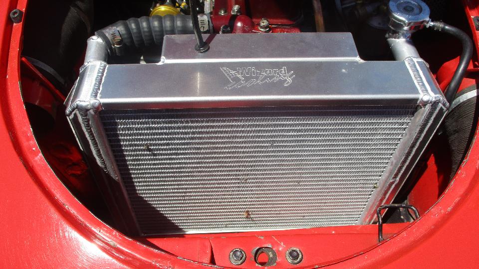 I always take some interest in the custom aluminum radiators, this one being a Wizard cross flow (left). I am not convinced that they work any better than an original cell core radiator (right). This alloy radiator (and the attached car) belong to a guy from Alaska who occasionally commutes between here and there while the car stays in California.
