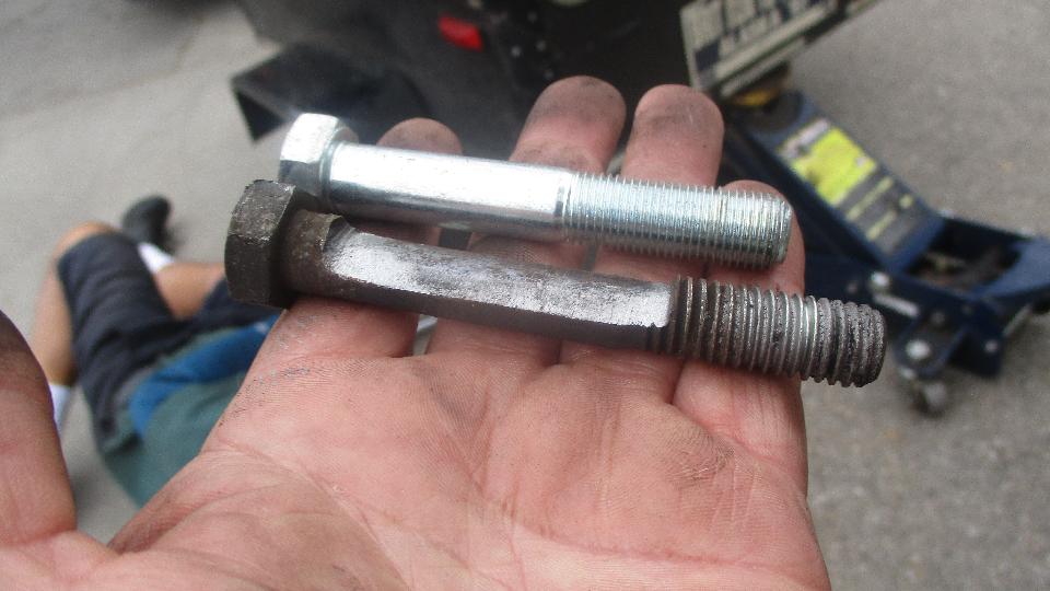 making the sliding spring leaf not slide (a factory origin defect). For an immediate fix I had positioned the spring leaf below the bolt rather than above it, and same for the other side so it would ride level. Then I forgot to go back and fix it properly. For 20 years since the spring leaf has been sliding against the bolt, which eventually has worn half through the bolts until one of them has broken. The trailer still works, just sits a bit crooked. It doesn't seem to have worn the spring leaf at all, so it is now back together with new bolts and may last another 28 years.