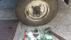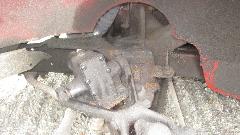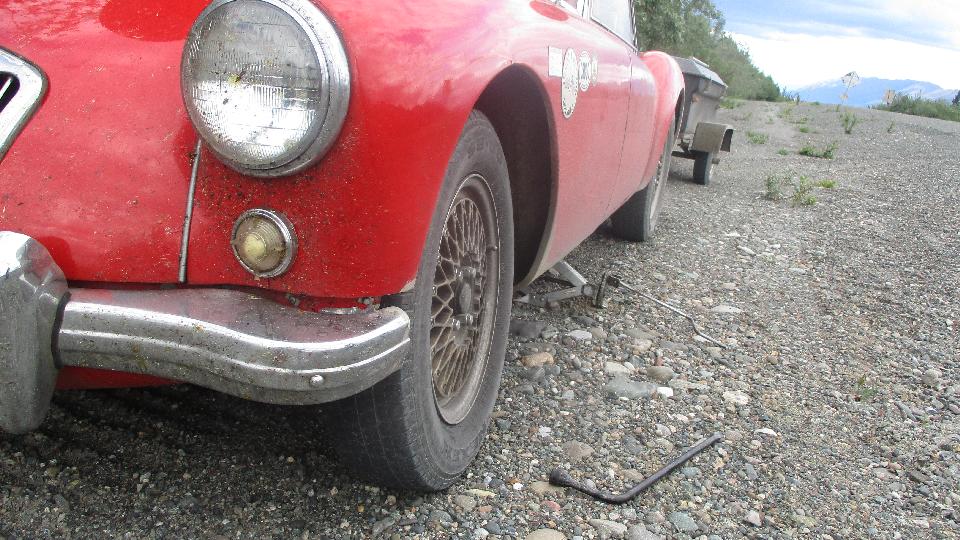 Alaska Hwy, somewhat deteriorated from 20 years ago, lots of frost heave and a million patches, constant undulations sometimes terminating with a harsh divot, hard on the suspension. Several short construction sites where the road swerves to one side through a 20 foot deep gravel pit to crawl up the other side, looks like designed to kill motor homes at anything more than 5-mph. Getting some confidence, hauled out of one of these pits at 10-mph and hit a huge pot hole and jump that finally buggered the suspension knocking the LF shock loose from the frame (been loose bolts for a while I suppose). Oops, a little camber error here. Two outboard bolts missing, one inboard bolt broken, one inboard bolt barely hanging on bent and stripped threads. Tried but failed to install a Heli-Coil in the inboard stripped thread, could not remove the broken inboard bolt (not enough space to work there conveniently). Installed two good studs in outboard holes, with lockwashers and good tight hex nuts, looks pretty secure, one hour roadside repair, and soldier on a bit slower, trying not to hit anything harsh.