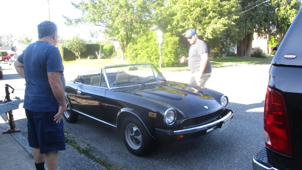 Another friend visiting for the day. That's a 1962 MGB, very early pull-handle car. Off to lunch, then to the store to get a new cell phone that will work in Canada. Also find another store that has the required memory chip for the GPS. And find a bank that will exchange some U.S. currency for Canadian currency.