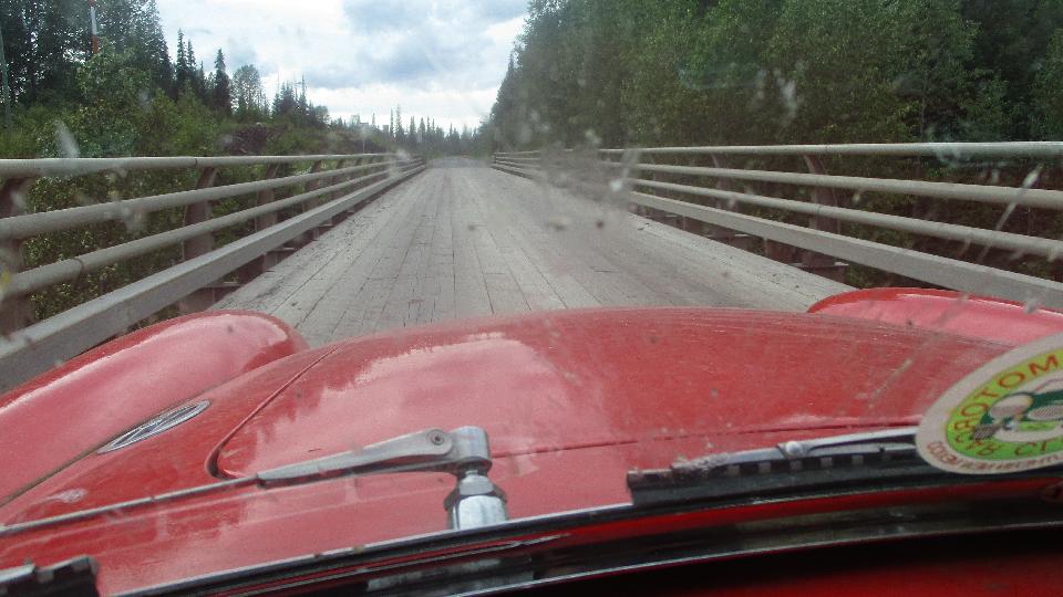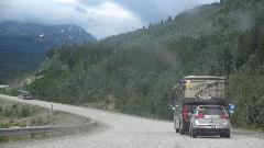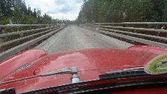 Thursday morning hung a left and took the Yellowhead Highway 300 miles (yes this is the scenic route). Sailing along 70-75 MPH when possible (most of the time), or 55 up some or the hills are 7-8% grades in 3rd gear with the trailer, wonderful scenery, not much traffic. BC-37/Stewart-Cassiar Hwy 97 miles, Cassiar Hwy/BC-37 352 miles just into Yukon Territory. The wooden bridge floors are common here, easy local materials supply in the wilderness I suppose, but they might be wicked slick when wet. They appear to be patched regularly (fresh boards) and are a smooth ride. Look closely a bit to right of center, and you may spot the head of a baby black bear in the tall grass. We saw a few bears, but need to be quick with the camera. This one was being frisky in the road before before he got out of harm's way.