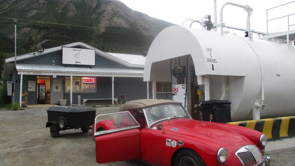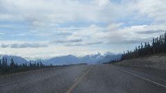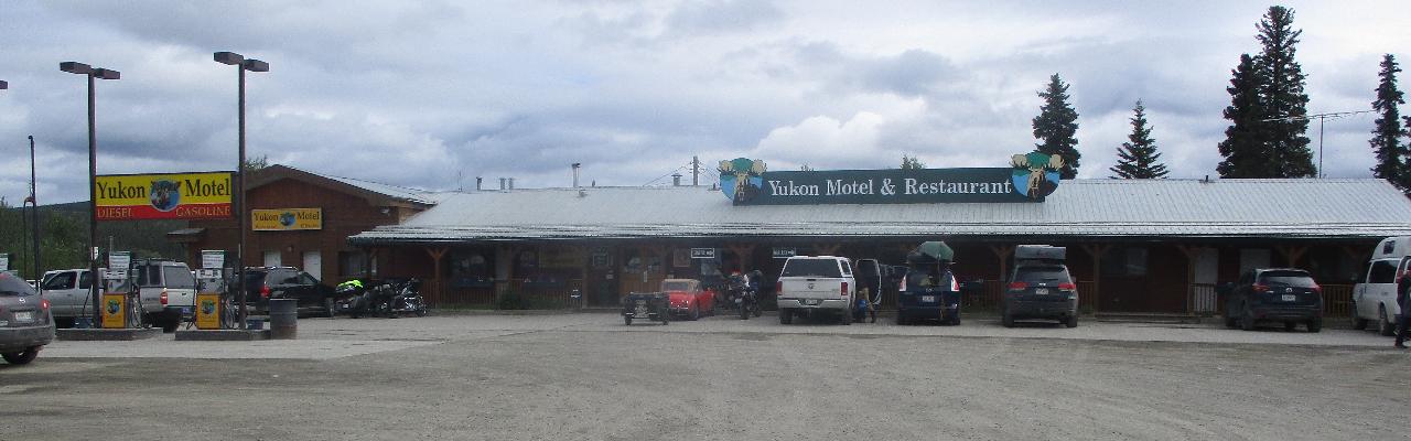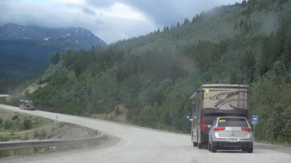 Off to a good start sailing through Yukon Territory. I recon half of the vehicles are either trucks towing travel trailers or motor homes towing cars. Lots of semi trucks of course, with single cars being in the minority. Traffic generally sparse, easy passing on the downhill grades. Breakfast stop in Teslin, Yukon was an interesting place, gas station, motel, restaurant, gift shop, wildlife gallery and Good Sam campground (maybe I missed a few).