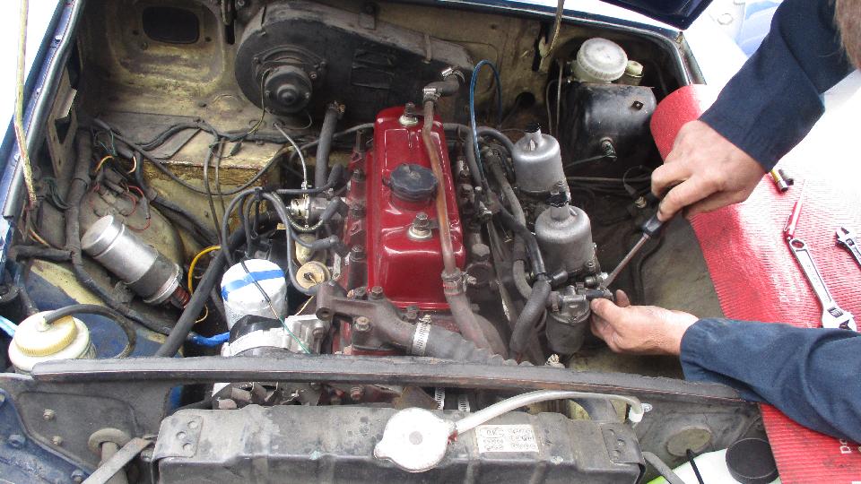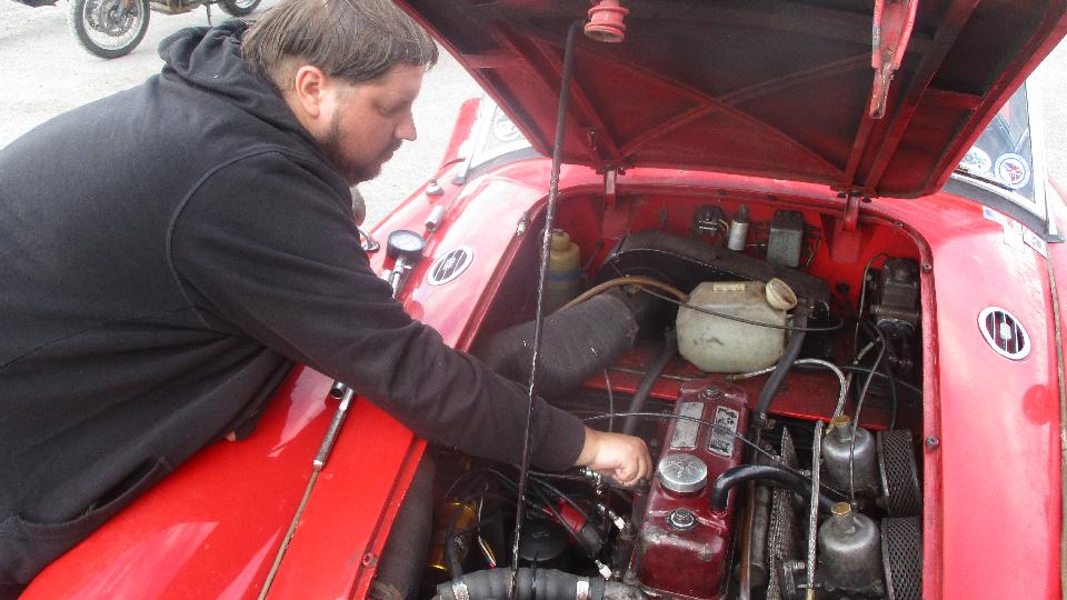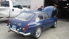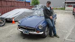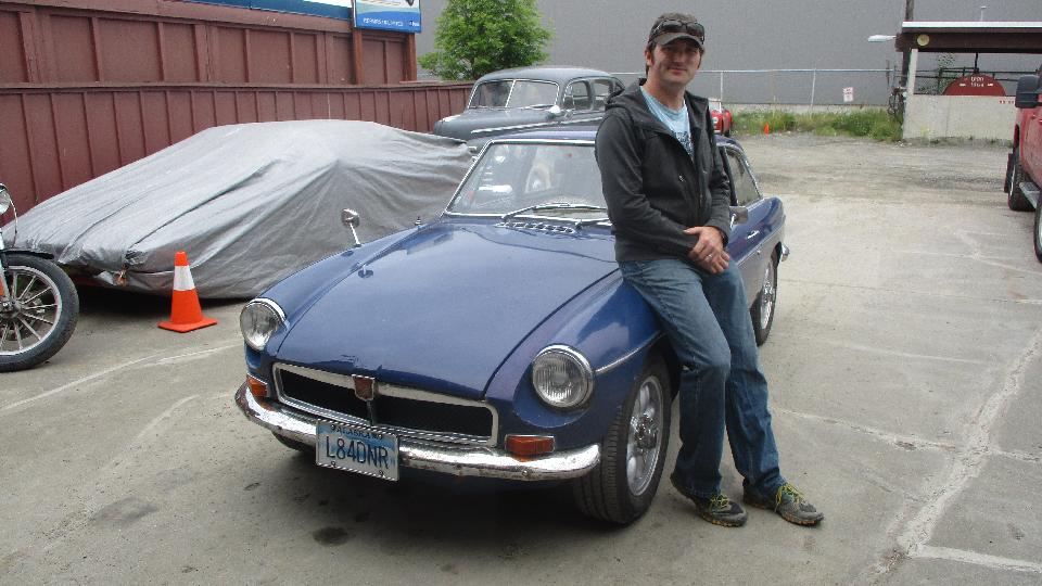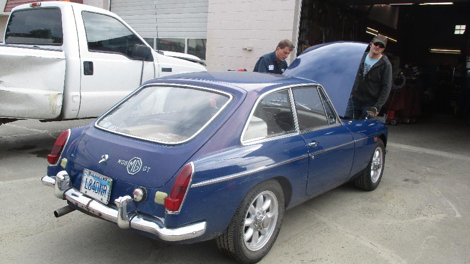 Back to Adrian's shop today to have a look at a 1969 MGB GT belonging to Luke Clement in Anchorage, AK. This car used to belong to his father, and was perhaps maintained for a long time on a shoe string budget. It appears to be mostly original, except missing the air pump. Adrian has previously done a lot of work on this one to get it back on the road. It now has negative camber A-arms to go with the fat tires for crisp handling, but it may still need kingpin bushings. It was running a but rough, fortunately only needing carburetor adjustments to purr like a kitten. Good to see Luke with a grin on his face after the tune up.