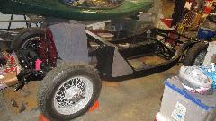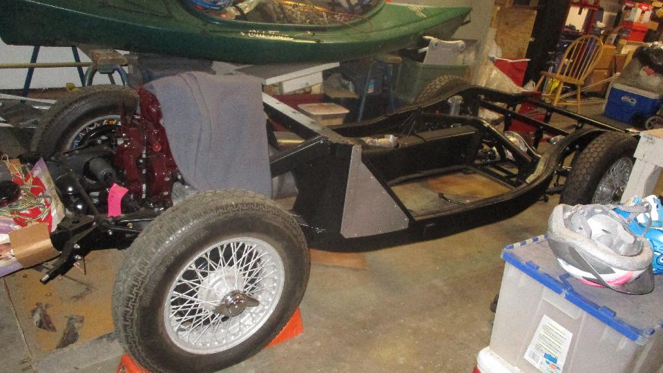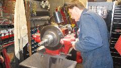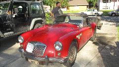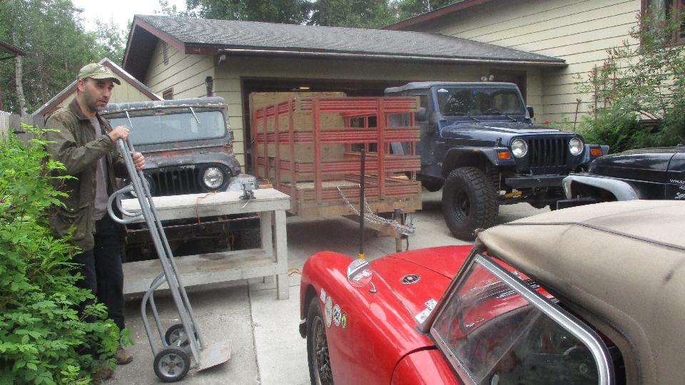Relaxed and spent four hours chatting with Del Rawlins in Anchorage. You think they like Jeeps up here? Most vehicles in Alaska will be four wheel drive. Near the garage, vintage Jeep on the left, and brother's Jeep on the right (may be needing some gearbox work). Then Del's back country Jeep, followed by the family hauler Wagoneer (the red one). And his sister's Wrangler was parked in the street to make room for my MGA in the driveway. Checking out his MGA restoration project, the car that used to belong to his father. Now why would I be so interested in his shock absorber mounting plate repair?