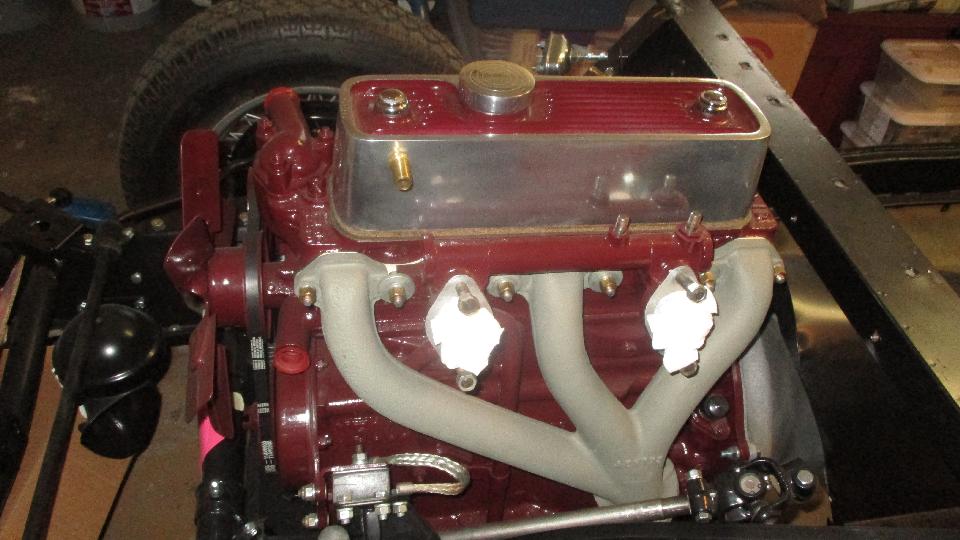 There's the infamous aftermarket alloy valve cover that had so much attention trying to find another like it for his brother's MGA project. Nice secure and leak proof screw-on oil filler cap. And there's the OEM style front sway bar from Moss motors with the special twist so it does not lie flat.